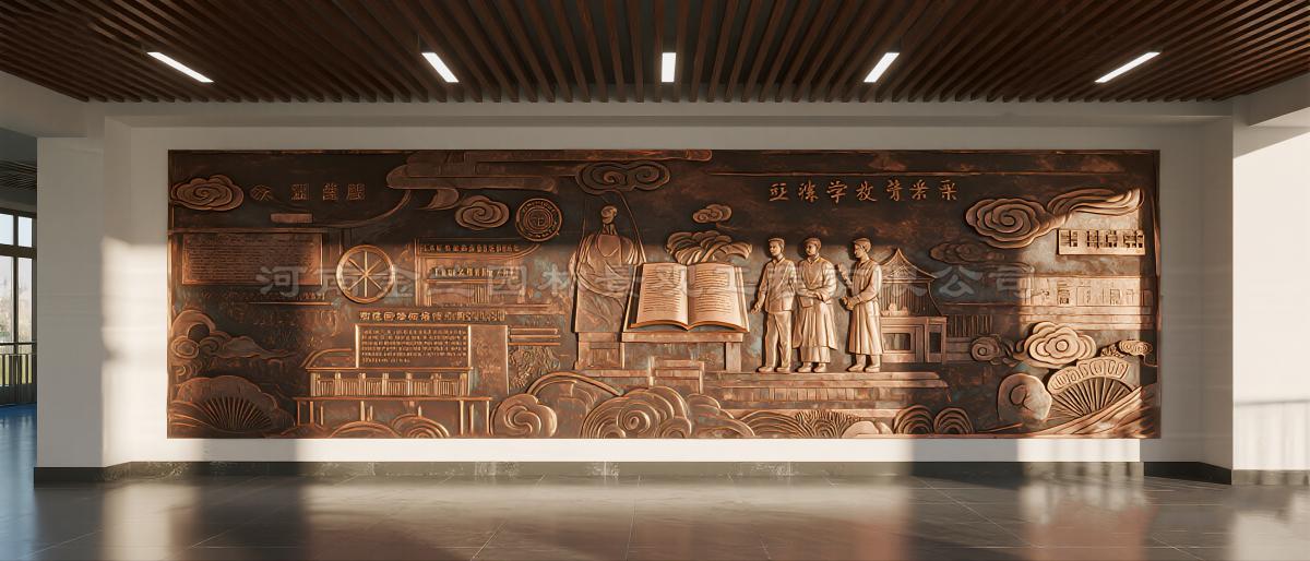 校园回廊的空间特性,决定了浮雕艺术的呈现形态。受建筑结构限制,回廊浮雕多以左右对称的双幅形式布局,既保持视觉平衡,又能通过连续叙事传递文化主题。这种设计既贴合建筑美学规律,又能让师生在行走中自然接收文化信息,实现 “移步见景,润物无声” 的教育效果。
