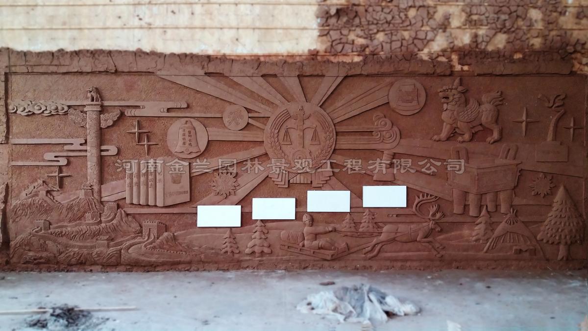 在祖国北疆的呼伦贝尔,一座承载法治精神与地域文化的艺术丰碑近日落成。金兰园林景观有限公司受委托,为其大厅照壁精心设计制作了正反两面浮雕文化墙。单幅长 7.5 米、高 2.5 米的宏大气势,结合手工泥塑、玻璃钢翻制及仿铜效果处理工艺,使浮雕既具历史厚重感,又彰显现代司法的人文温度,成为法院文化建设的标志性作品。