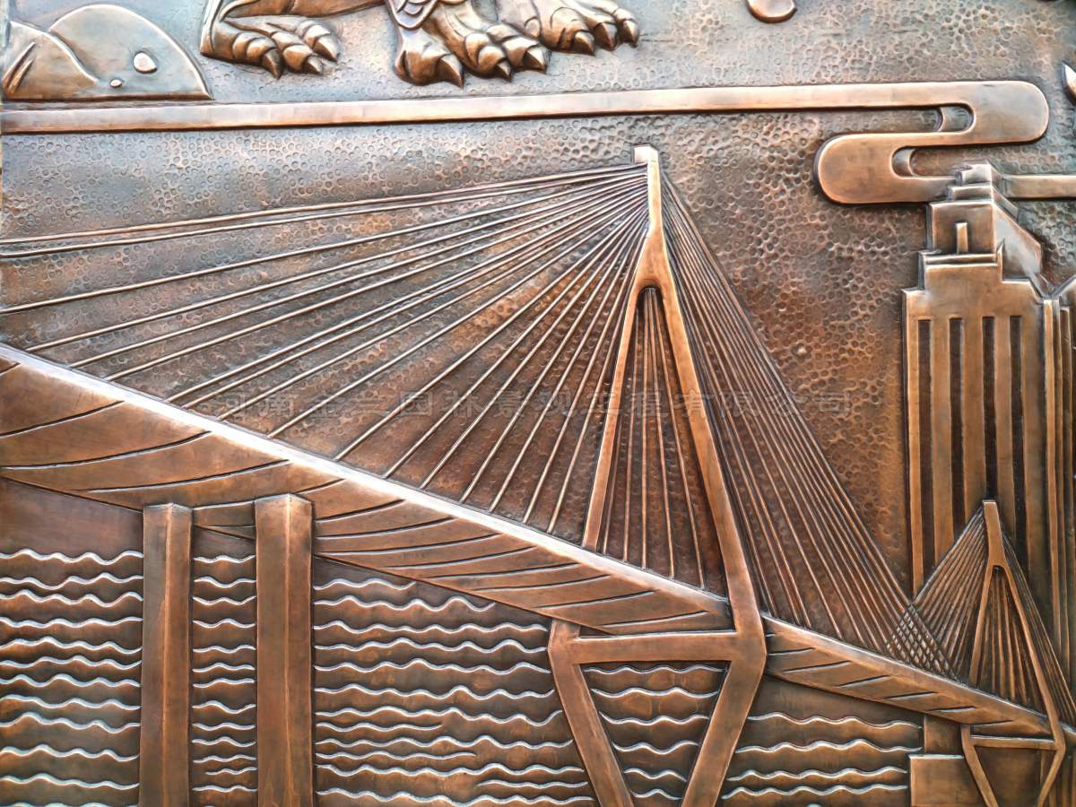 "每平方厘米需控制36-42次敲击力度,既要保证造型精准,又不能破坏铜板延展性。"项目工艺总监介绍,团队采用"整体锻造、分段塑形"的施工方案,在确保2.8米×3.2米整铜板结构完整性的同时,通过热加工与冷作结合的复合工艺,实现建筑体块、人物肌理、装饰纹样等多重艺术效果的和谐统一。