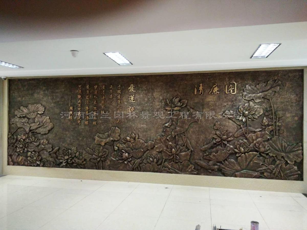 背面浮雕以一幅清雅的《青莲图》为主体,墨色渲染的荷叶间,荷花亭亭玉立,与周敦颐《爱莲说》的鎏金铭文相得益彰。“出淤泥而不染” 的文化意象,既是对法官职业操守的生动诠释,也呼应了法院廉政建设的核心诉求。相较于正面的恢弘叙事,背面以传统水墨的写意手法,营造出宁静致远的文化氛围,形成 “刚与柔”“显与隐” 的视觉与精神双重对话,使整个照壁在功能上兼具仪式感与教化意义。