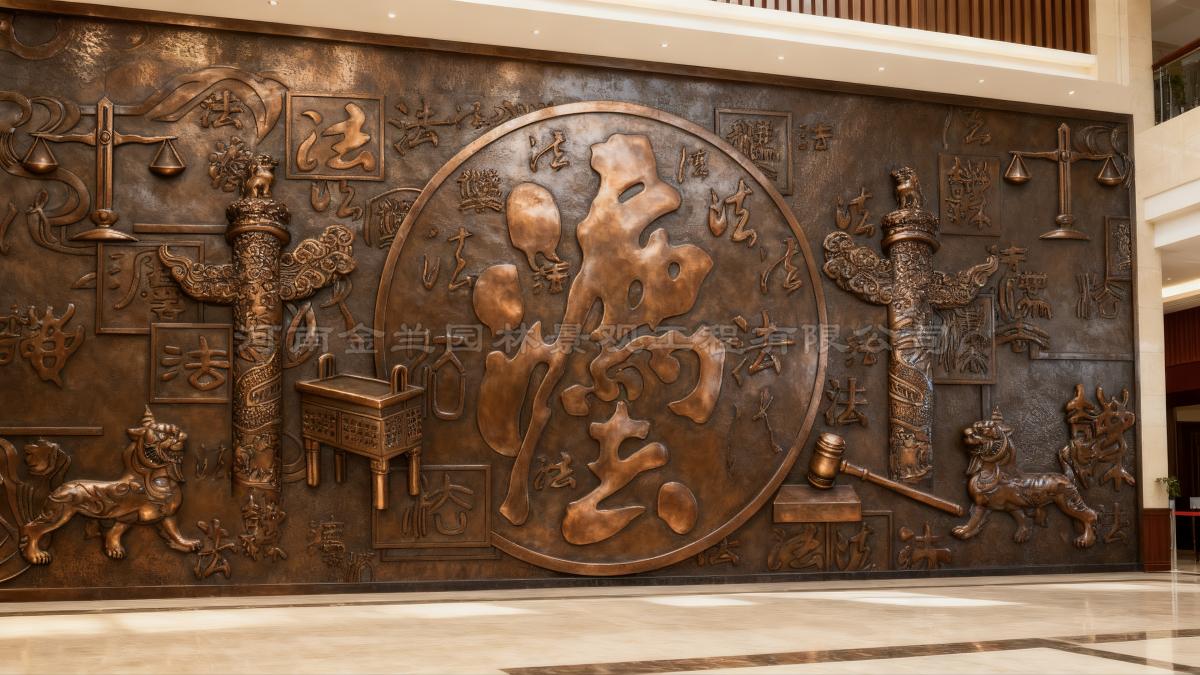 在全面推进依法治国的时代背景下,法治文化建设成为彰显司法精神、传递价值理念的重要载体。金兰园林景观有限公司以精湛工艺为天水市秦安县人民法院新办公楼大厅量身定制的紫铜浮雕壁画正式落成。这幅长7.5米、高4.5米的巨型浮雕,以“法”文化为核心,将传统文化符号与现代司法精神深度融合,成为法院空间中兼具艺术价值与法治内涵的标志性作品。